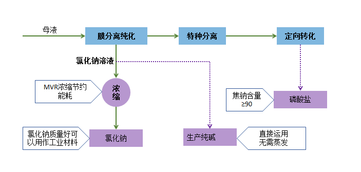 該技術(shù)以膜技術(shù)為核心,將磷和鹽進行徹底分離,整合焚燒和MVR工藝。將母液中的磷資源定向轉(zhuǎn)化為焦磷酸鈉回收,并副產(chǎn)工業(yè)鹽,具有處理流程短、效率高、資源化產(chǎn)品質(zhì)量好等優(yōu)點。