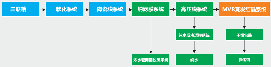 設(shè)計(jì)工藝:廢水-三聯(lián)箱-軟化系統(tǒng)-納濾分鹽-高壓濃縮-蒸發(fā)結(jié)晶