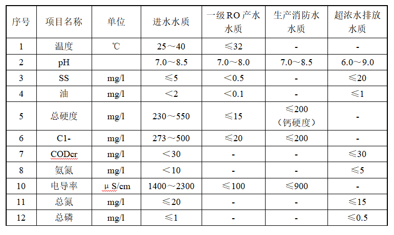 設(shè)計工藝:降溫冷卻系統(tǒng)+浸沒式超濾系統(tǒng)+一級反滲透系統(tǒng)+一級反滲透濃水處理系統(tǒng)+超濃水處理系統(tǒng)
