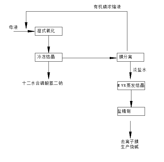 對于濕式氧化等高級氧化工藝,針對其一次的轉(zhuǎn)化率不高的問題,在通過濕式氧化,并降溫結(jié)晶獲得十二水合磷酸氫二鈉后,將鹽水通過膜濃縮工藝,將濃縮后的有機(jī)磷繼續(xù)回濕式氧化工序,循環(huán)套用提高其總的轉(zhuǎn)化率,其膜分離出的鹽水,經(jīng)MVR蒸發(fā)結(jié)晶后,精制制備離子膜鹽水用鹽。